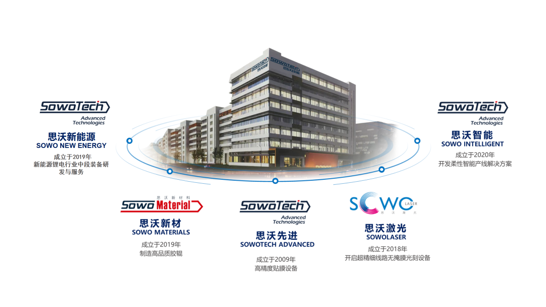 集團旗下擁有高精度貼膜設備思沃先進裝備,開發柔性智能產線解決方案的思沃智能,開啟超精細線路無掩膜光刻設備的思沃激光,新能源鋰電設備思沃新能源,制造高品質膠輥的思沃新材。